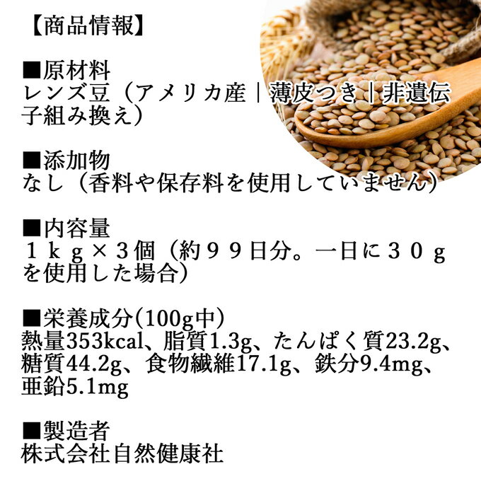 原材料名 レンズ豆(アメリカ産|薄皮つき|非遺伝子組み換え) 内容量 1kg×3個(約99日分。